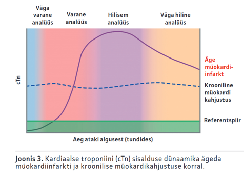 Ägeda müokardiinfarkti korral esineb cTn väärtuste suurenemine ja/või vähenemine koos kliiniliste tunnustega, mis viitavad müokardi isheemiale (EKG muutused, müokardi isheemia sümptomid, piltdiagnostikameetoditega tõendatud eluvõimelise müokardi uus kadu, koronarograafial või lahangul intrakoronaarne tromb jm), kusjuures vähemalt üks cTn väärtus peab ületama ülemise referentspiiri. Tõusva ja/või langeva dünaamika näitamine on vajalik, et eristada ägedat müokardi kahjustust kroonilisest (vt joonist 3).