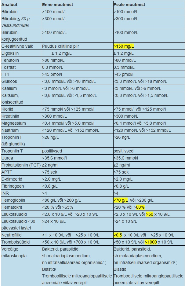 Meeldetuletusena toome siinkohal tabelina välja kõik kriitilised tulemused. Muudatused on esile toodud kollasena ning need on kooskõlastatud ja heaks kiidetud Eesti Perearstide Seltsi poolt.